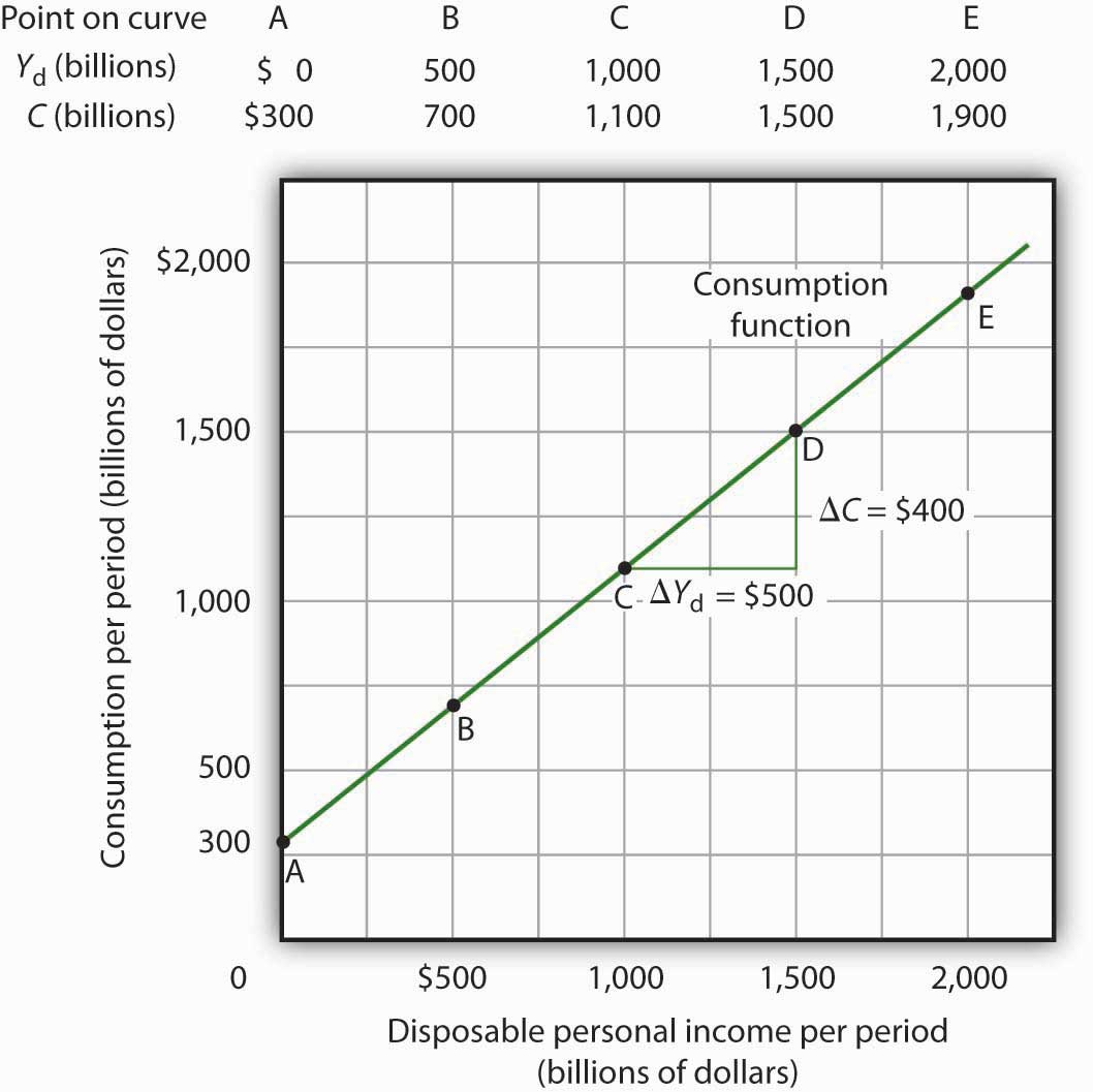 Figure 28.2 "Plotting a Consumption Function" illustrates the consumption function. The relationship between consumption and disposable personal income that we encountered in Figure 28.1 "The Relationship between Consumption and Disposable Personal Income, 1960–2011" is evident in the table and in the curve: consumption in any period increases as disposable personal income increases in that period. The slope of the consumption function tells us by how much. Consider points C and D. When disposable personal income (Yd) rises by $500 billion, consumption rises by $400 billion. More generally, the slope equals the change in consumption divided by the change in disposable personal income. The ratio of the change in consumption (ΔC) to the change in disposable personal income (ΔYd) is the marginal propensity to consumeThe ratio of the change in consumption (ΔC) to the change in disposable personal income (ΔYd). (MPC). The Greek letter delta (Δ) is used to denote “change in.”