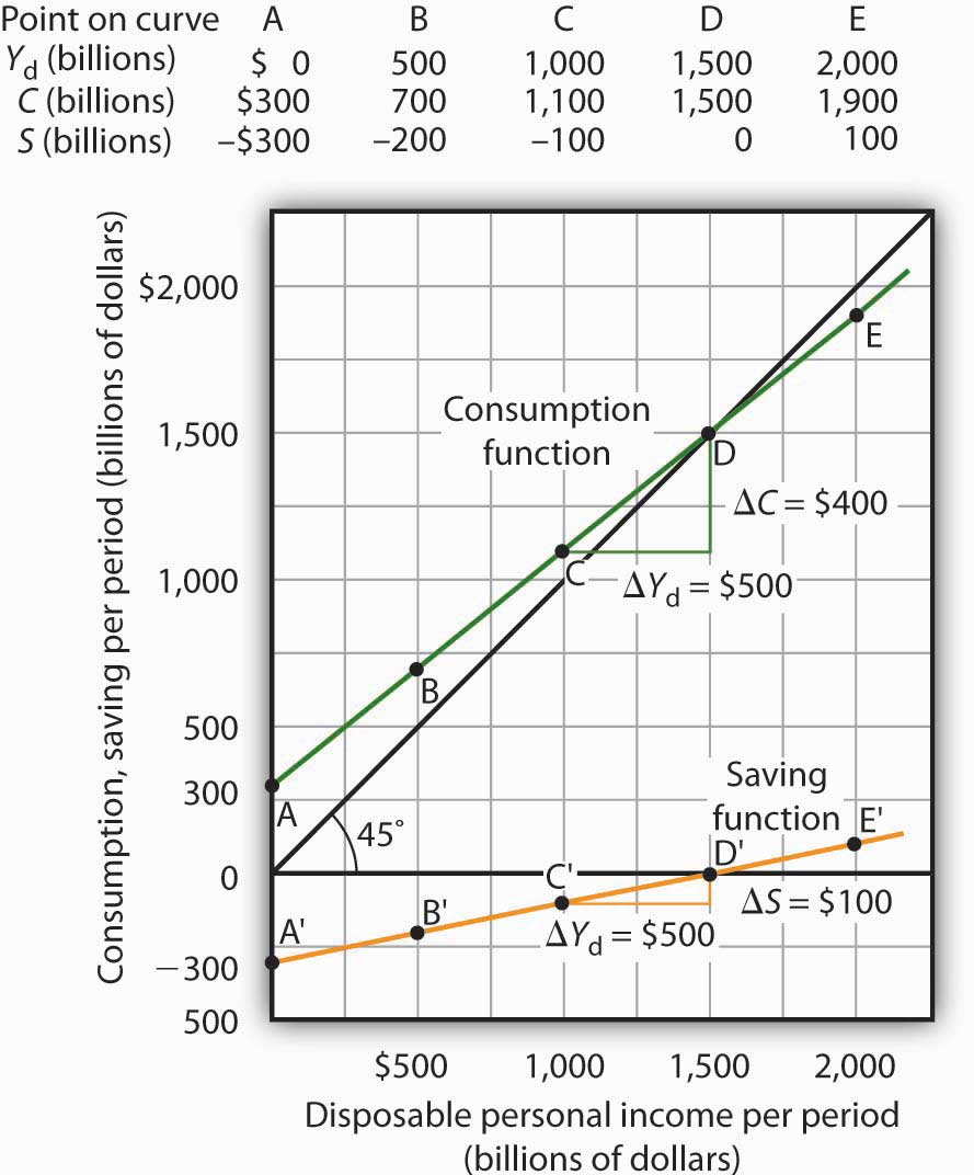 Notice that for every $500 billion increase in disposable personal income, personal saving rises by $100 billion. Consider points C′ and D′ in Figure 28.3 "Consumption and Personal Saving". When disposable personal income rises by $500 billion, personal saving rises by $100 billion. More generally, the slope of the saving function equals the change in personal saving divided by the change in disposable personal income. The ratio of the change in personal saving (ΔS) to the change in disposable personal income (ΔYd) is the marginal propensity to saveThe ratio of the change in personal saving (ΔS) to the change in disposable personal income (ΔYd). (MPS).