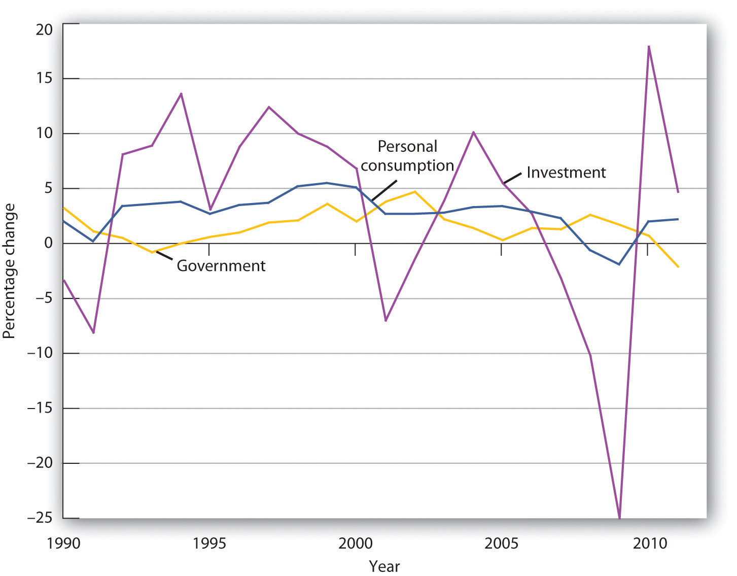 Investment, measured as GPDI, is among the most volatile components of GDP. In percentage terms, year-to-year changes in GPDI are far greater than the year-to-year changes in consumption or government purchases. Net exports are also quite volatile, but they represent a much smaller share of GDP. Figure 29.3 "Changes in Components of Real GDP, 1990–2011" compares annual percentage changes in GPDI, personal consumption, and government purchases. Of course, a dollar change in investment will be a much larger change in percentage terms than a dollar change in consumption, which is the largest component of GDP. But compare investment and government purchases: their shares in GDP are comparable, but investment is clearly more volatile.