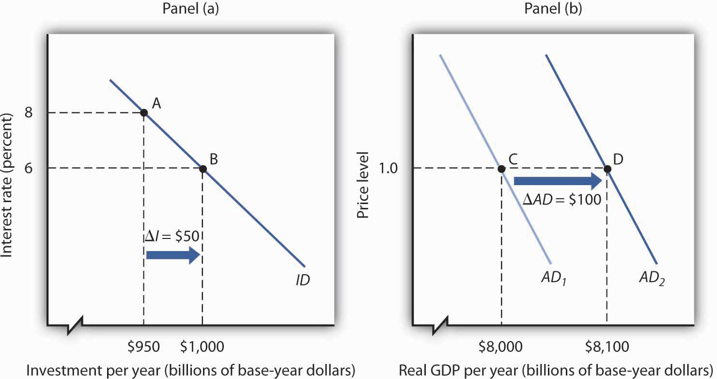 In the short run, changes in investment cause aggregate demand to change. Consider, for example, the impact of a reduction in the interest rate, given the investment demand curve (ID). In Figure 29.6 "A Change in Investment and Aggregate Demand", Panel (a), which uses the investment demand curve introduced in Figure 29.5 "The Investment Demand Curve", a reduction in the interest rate from 8% to 6% increases investment by $50 billion per year. Assume that the multiplier is 2. With an increase in investment of $50 billion per year and a multiplier of 2, the aggregate demand curve shifts to the right by $100 billion to AD2 in Panel (b). The quantity of real GDP demanded at each price level thus increases. At a price level of 1.0, for example, the quantity of real GDP demanded rises from $8,000 billion to $8,100 billion per year.