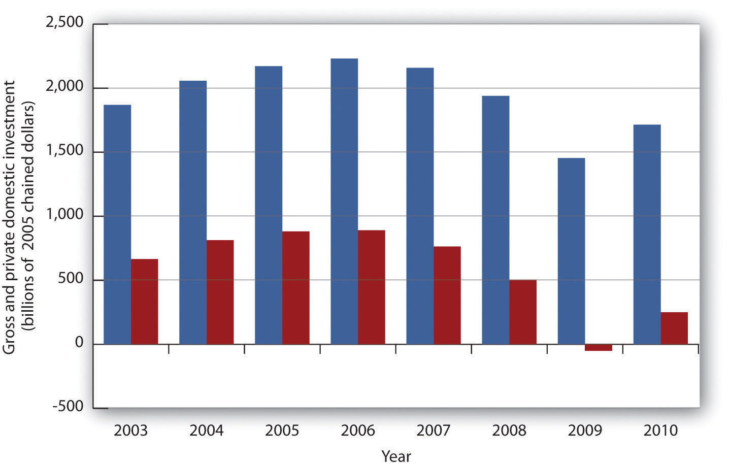 A third—very brief and very small—encounter with negative net private domestic investment occurred in 2009, when it fell by $1 billion (in 2005 dollars).