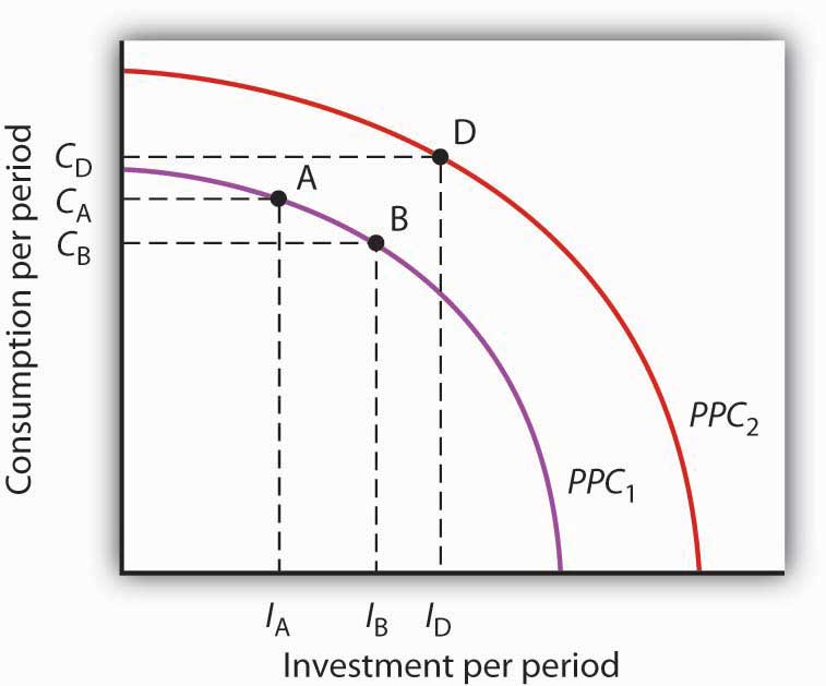Figure 29.4 "The Choice between Consumption and Investment" shows a production possibilities curve for an economy that can produce two kinds of goods: consumption goods and investment goods. An economy operating at point A on PPC1 is using its factors of production fully and efficiently. It is producing CA units of consumption goods and IA units of investment each period. Suppose that depreciation equals IA, so that the quantity of investment each period is just sufficient to replace depreciated capital; net investment equals zero. If there is no change in the labor force, in natural resources, or in technology, the production possibilities curve will remain fixed at PPC1.