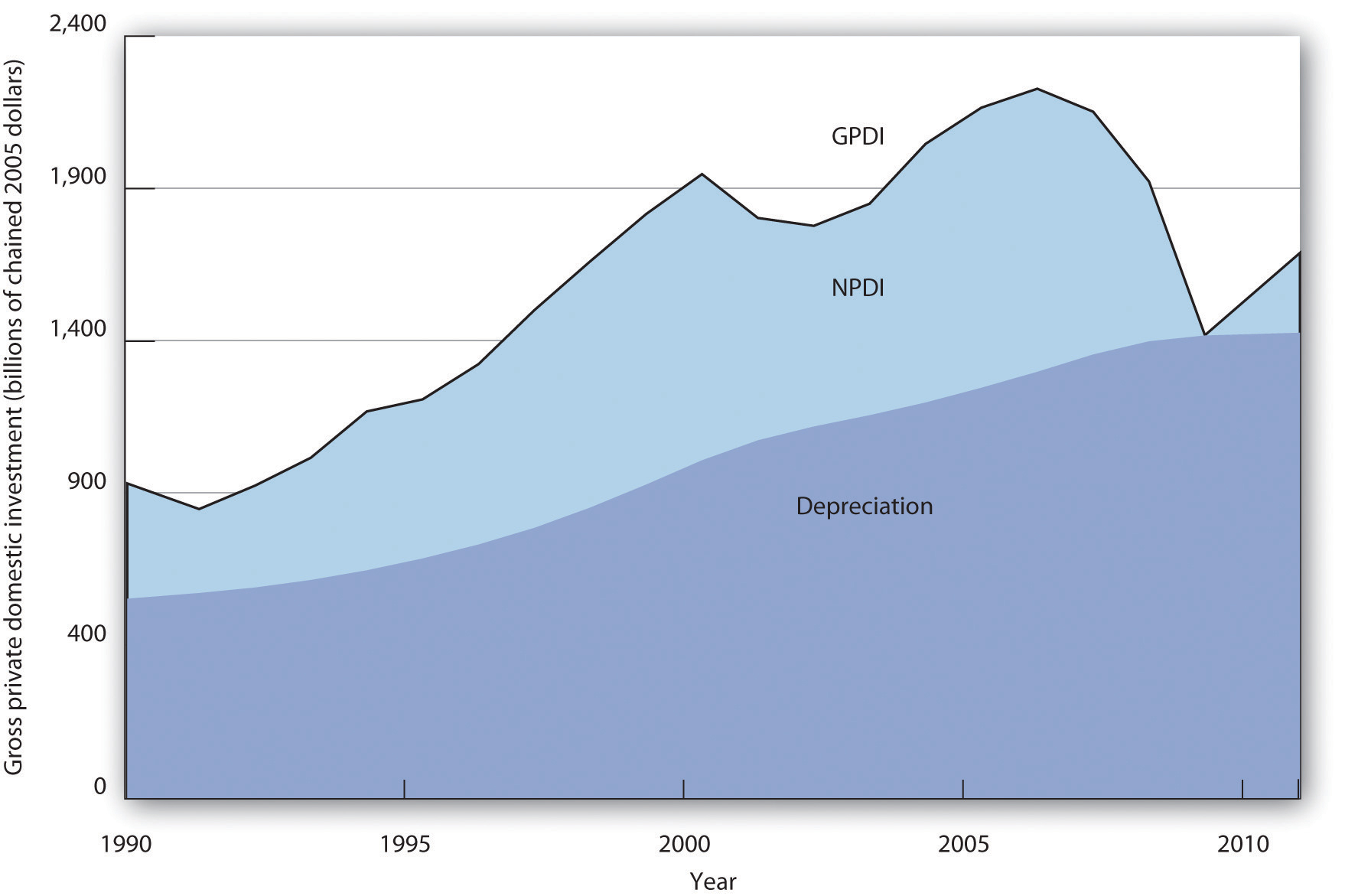 Figure 29.2 "Gross Private Domestic Investment, Depreciation, and Net Private Domestic Investment, 1990–2011" reports the real values of GPDI, depreciation, and NPDI from 1990 to 2011. We see that the bulk of GPDI replaces capital that has been depreciated. Notice the sharp reductions in NPDI during the recessions of 1990–1991, 2001, and especially 2007–2009.