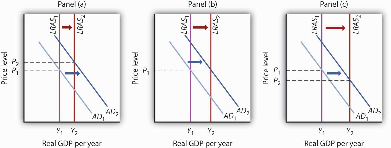 Panel (c) shows LRAS shifting by more than AD; the price level falls in the long run.