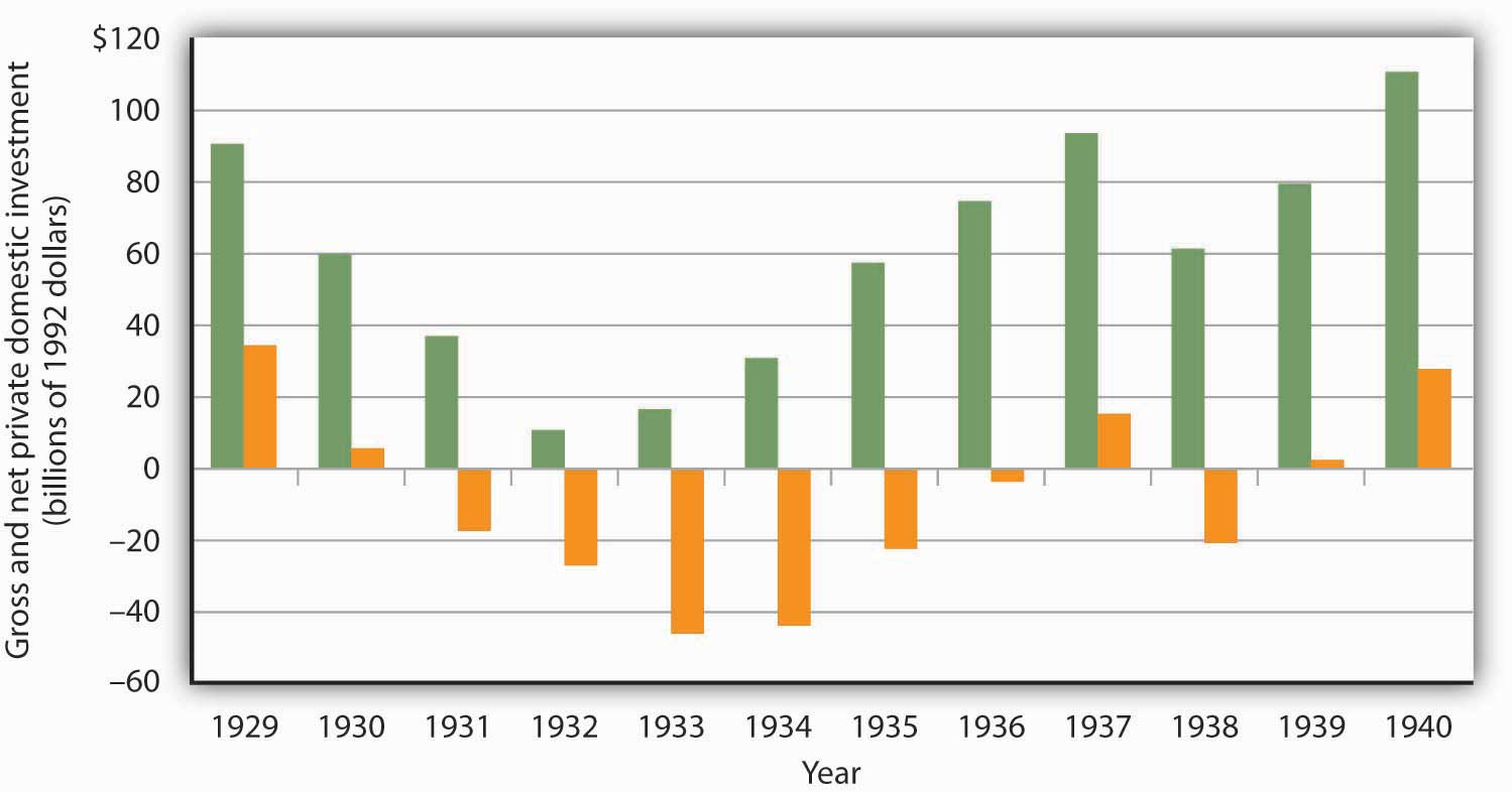Aggregate demand plunged during the first four years of the Depression. As firms cut their output in response to reductions in demand, their need for capital fell as well. They reduced their capital by holding gross private domestic investment below depreciation beginning in 1931. That produced negative net private domestic investment; it remained negative until 1936 and became negative again in 1938. In all, firms reduced the private capital stock by more than $529.5 billion (in 2007 dollars) during the period.