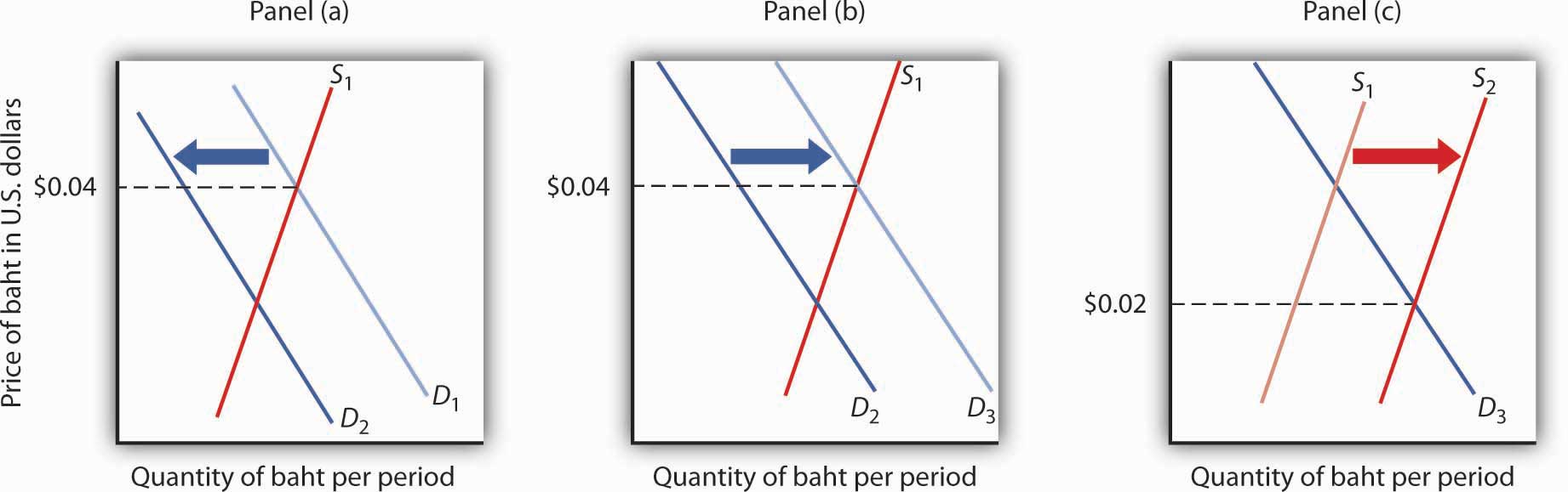 Weakness in the Japanese economy, among other factors, led to a reduced demand for the baht (Panel [a]). That put downward pressure on the baht’s value relative to other currencies. Committed to keeping the price of the baht at $0.04, Thailand’s central bank bought baht to increase the demand, as shown in Panel (b). However, as holders of baht and other Thai assets began to fear that the central bank might give up its effort to prop up the baht, they sold baht, shifting the supply curve for baht to the right (Panel [c]) and putting more downward pressure on the baht’s price. Finally, in July of 1997, the central bank gave up its effort to prop up the currency. By the end of the year, the baht’s dollar value had fallen to about $0.02.