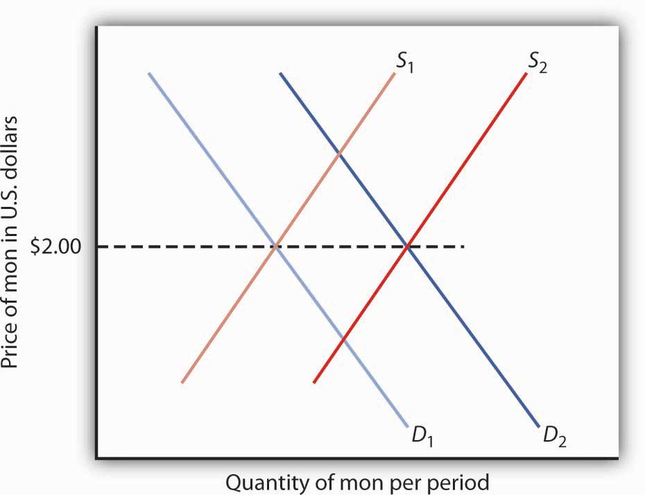 The value of the mon is initially $2. Fear that the mon might fall will lead to an increase in its supply to S2, putting downward pressure on the currency. To maintain the value of the mon at $2, the central bank will buy mon, thus shifting the demand curve to D2. This policy, though, creates two difficulties. First, it requires that the bank sell other currencies, and a sale of any asset by a central bank is a contractionary monetary policy. Second, the sale depletes the bank’s holdings of foreign currencies. If holders of the mon fear the central bank will give up its effort, then they might sell mon, shifting the supply curve farther to the right and forcing even more vigorous action by the central bank.