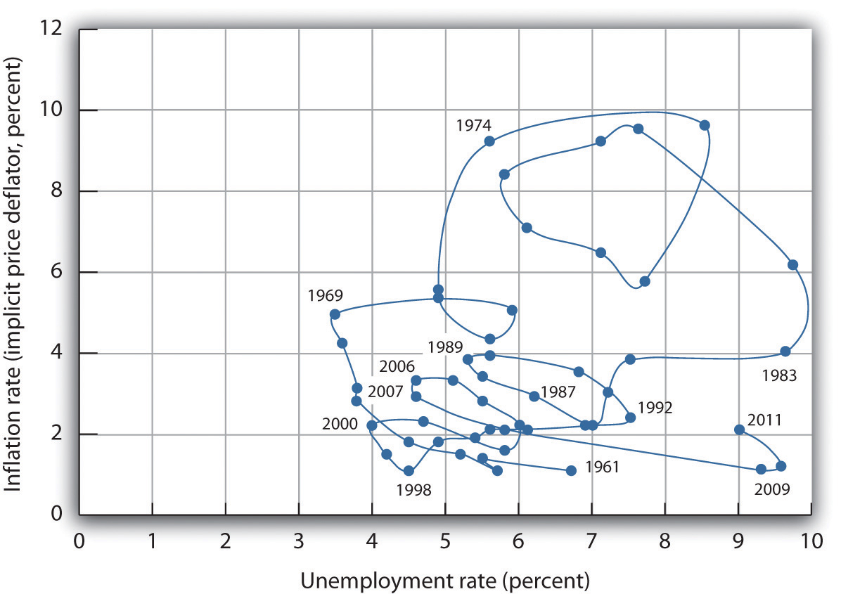 Although the points plotted in Figure 31.3 "Inflation and Unemployment, 1961–2011" are not consistent with a negatively sloped, stable Phillips curve, connecting the inflation/unemployment points over time allows us to focus on various ways that these two variables may be related.