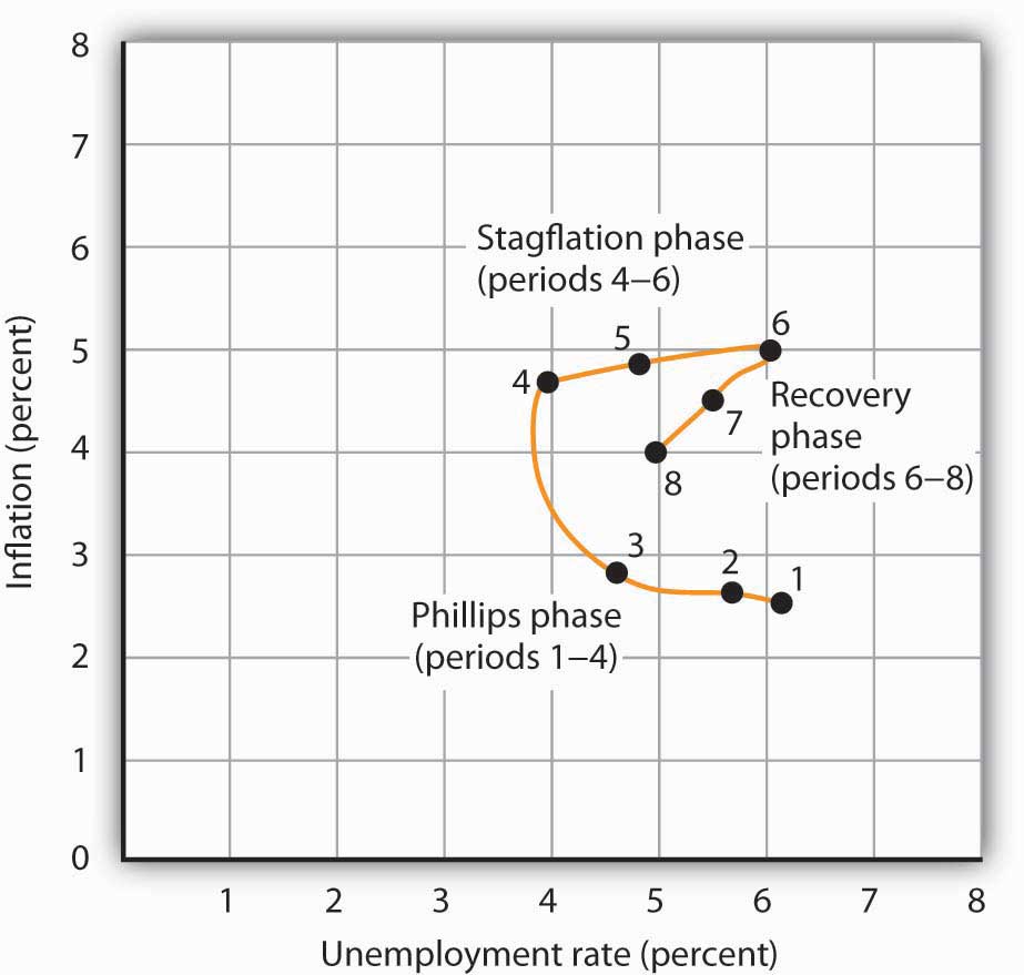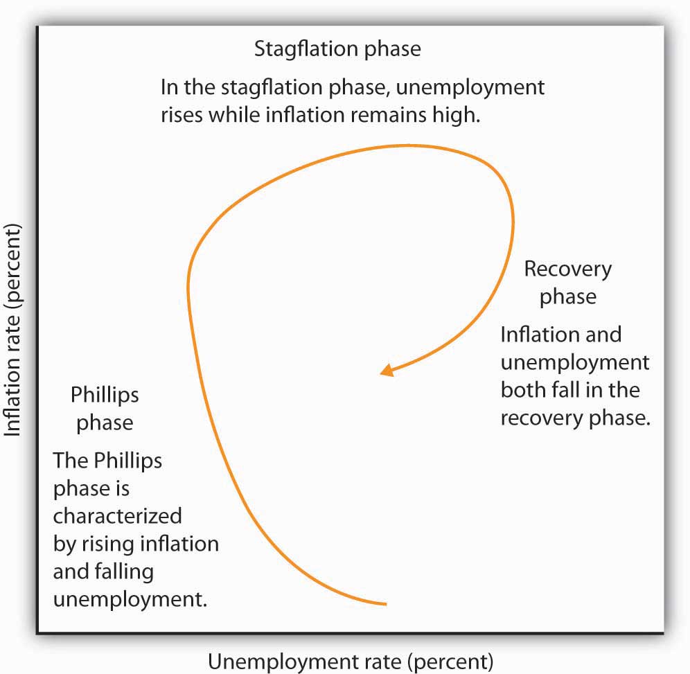The figure shows the way an economy may move from a Phillips phase to a stagflation phase and then to a recovery phase.
