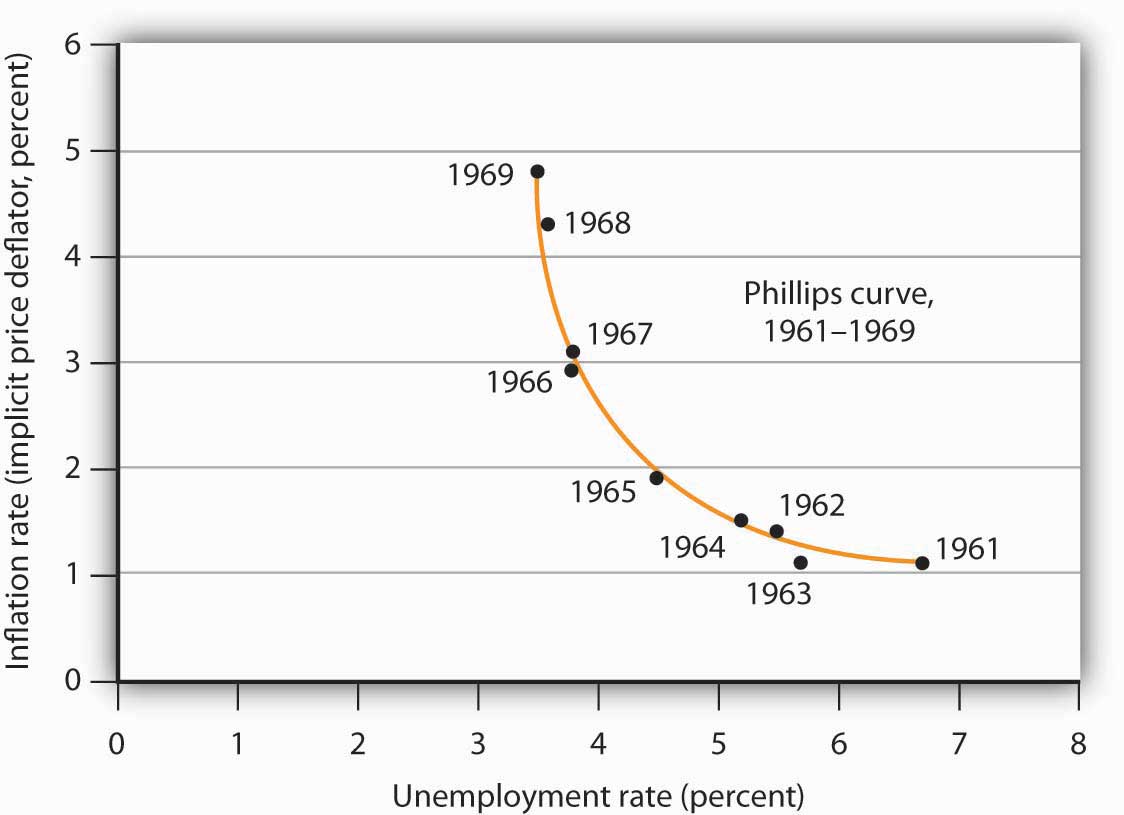 Values of U.S. inflation and unemployment rates during the 1960s generally conformed to the trade-off implied by the short-run Phillips curve. The points for each year lie close to a curve with the shape that Phillips’s analysis predicted.