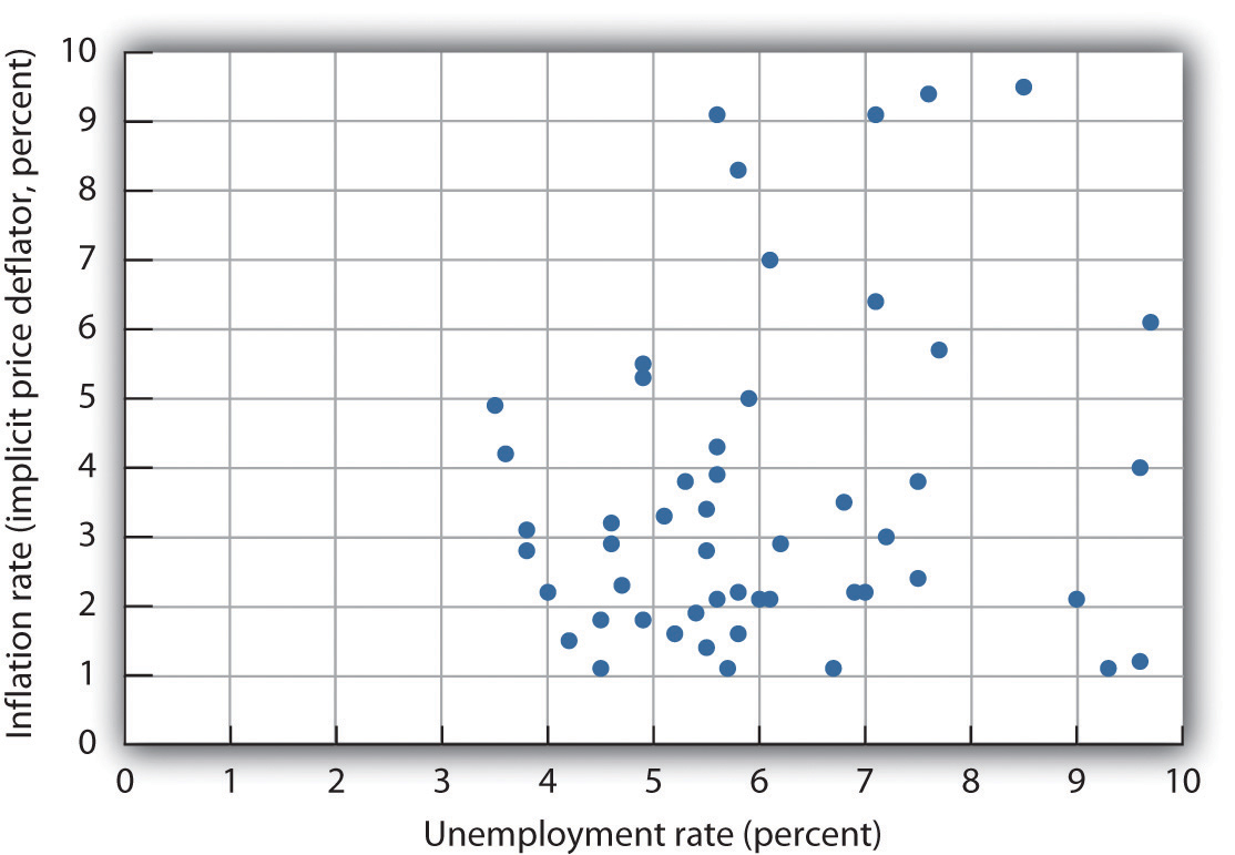 Indeed, a look at annual rates of inflation and unemployment since 1961 suggests that the 1960s were quite atypical. Figure 31.3 "Inflation and Unemployment, 1961–2011" shows the two variables over the period from 1961 through 2011. It is hard to see a negatively sloped Phillips curve lurking within that seemingly random scatter of points.