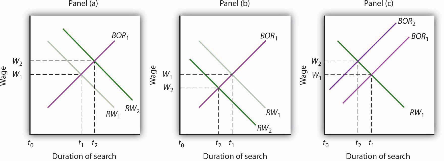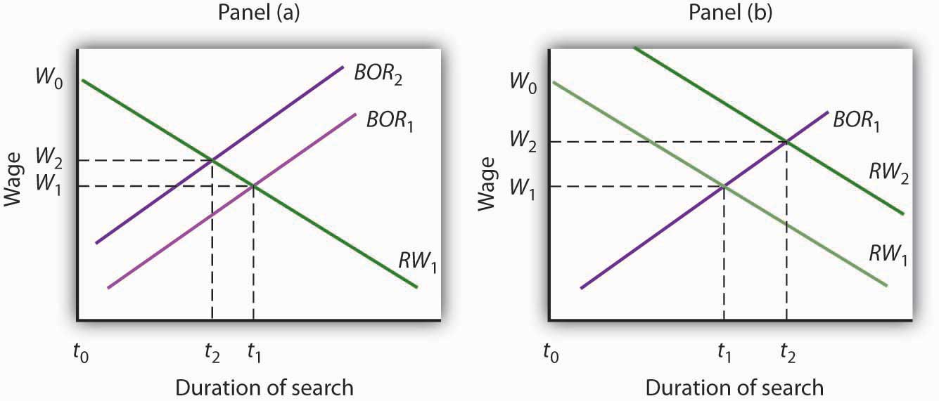 Public policy can influence the time required for job-seeking workers and worker-seeking firms to find each other. Programs that provide labor-market information tend to shift the best-offer-received (BOR) curves of individual workers to the left, reducing the duration of job search and reducing unemployment, as in Panel (a). Note that the wage these workers obtain also rises to W2. Unemployment compensation tends to increase the period over which a worker will hold out for a particular wage, shifting the reservation wage (RW) curve to the right, as in Panel (b). Unemployment compensation thus boosts the unemployment rate and increases the wage workers obtain when they find employment.