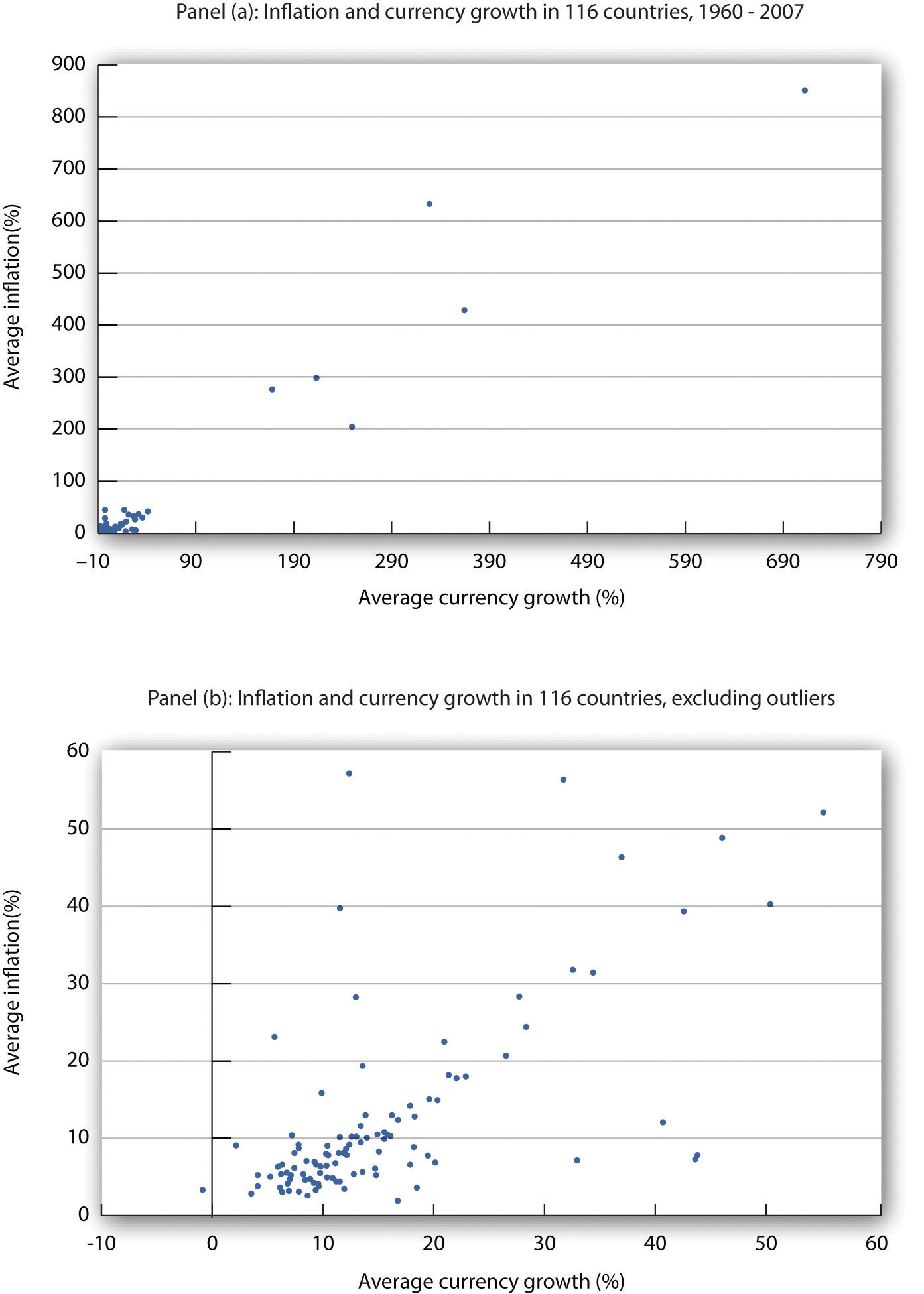 Numerous studies point to the strong relationship between money growth and inflation, especially for high-inflation countries. Figure 31.9 "Money Growth Rates and Inflation over the Long Run" is from a recent study by economist John Thornton. It is based on a sample of 116 countries from 1960 to 2007. Panel (a) includes all 116 countries, while Panel (b) excludes 6 outlier countries with inflation rates ranging from 200% to more than 850%. While the relationship is clearly not precise, the graphs suggest support for the quantity theory of money. A more detailed statistical analysis shows that when the annual inflation rate averages more than 10%, the relationship seems to hold. The Thornton study uses currency as the monetary aggregate because the definitions of M1 and M2 are not stable across such a wide sample of countries over long periods of time.John Thornton, “Further Evidence on Money and Inflation in the Long Run,” Applied Economics Letters 18 (2011): 1443–447.