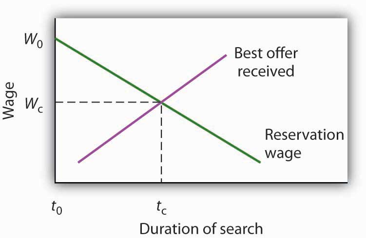 The search begins at time t0, with the unemployed worker seeking wage W0. Because the worker’s reservation wage exceeds the best offer received, the worker continues the search. The worker reduces his or her reservation wage and accumulates better offers until the two curves intersect at time tc. The worker accepts wage Wc, and the job search is terminated.