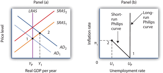 Figure 31.6 "A Phillips Phase" shows how a Phillips phase can unfold. Panel (a) shows the model of aggregate demand and aggregate supply; Panel (b) shows the corresponding path of inflation and unemployment.