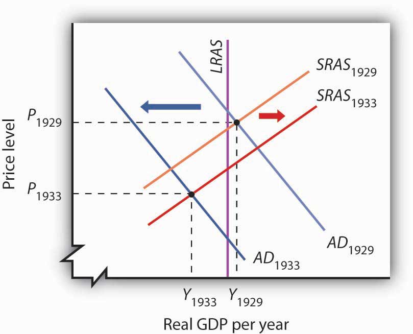 Slumping aggregate demand brought the economy well below the full-employment level of output by 1933. The short-run aggregate supply curve increased as nominal wages fell. In this analysis, and in subsequent applications in this chapter of the model of aggregate demand and aggregate supply to macroeconomic events, we are ignoring shifts in the long-run aggregate supply curve in order to simplify the diagram.