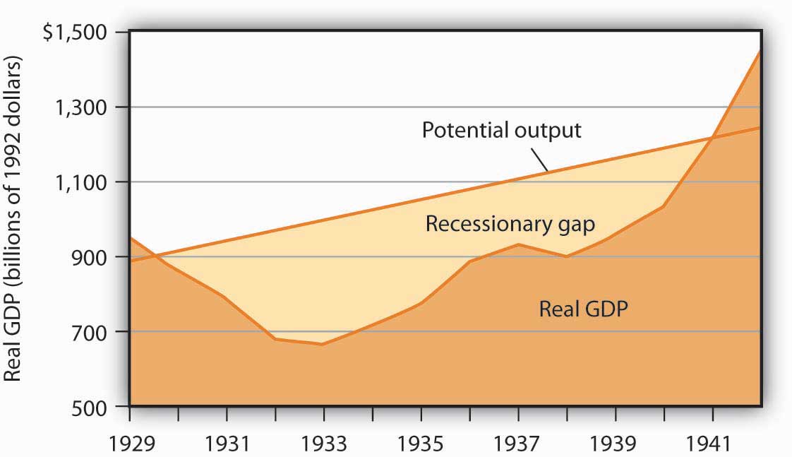 Figure 32.1 "The Depression and the Recessionary Gap" shows the course of real GDP compared to potential output during the Great Depression. The economy did not approach potential output until 1941, when the pressures of world war forced sharp increases in aggregate demand.