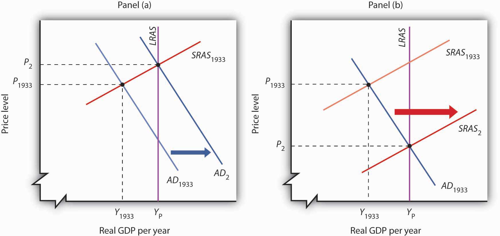 An expansionary fiscal or monetary policy, or a combination of the two, would shift aggregate demand to the right as shown in Panel (a), ideally returning the economy to potential output. One piece of evidence suggesting that fiscal policy would work is the swiftness with which the economy recovered from the Great Depression once World War II forced the government to carry out such a policy. An alternative approach would be to do nothing. Ultimately, that should force nominal wages down further, producing increases in short-run aggregate supply, as in Panel (b). We do not know if such an approach might have worked; federal policies enacted in 1933 prevented wages and prices from falling further than they already had.