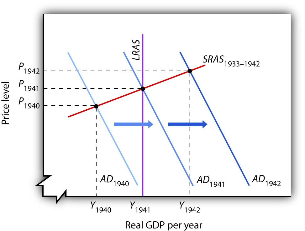 Increased U.S. government purchases, prompted by the beginning of World War II, ended the Great Depression. By 1942, increasing aggregate demand had pushed real GDP beyond potential output.