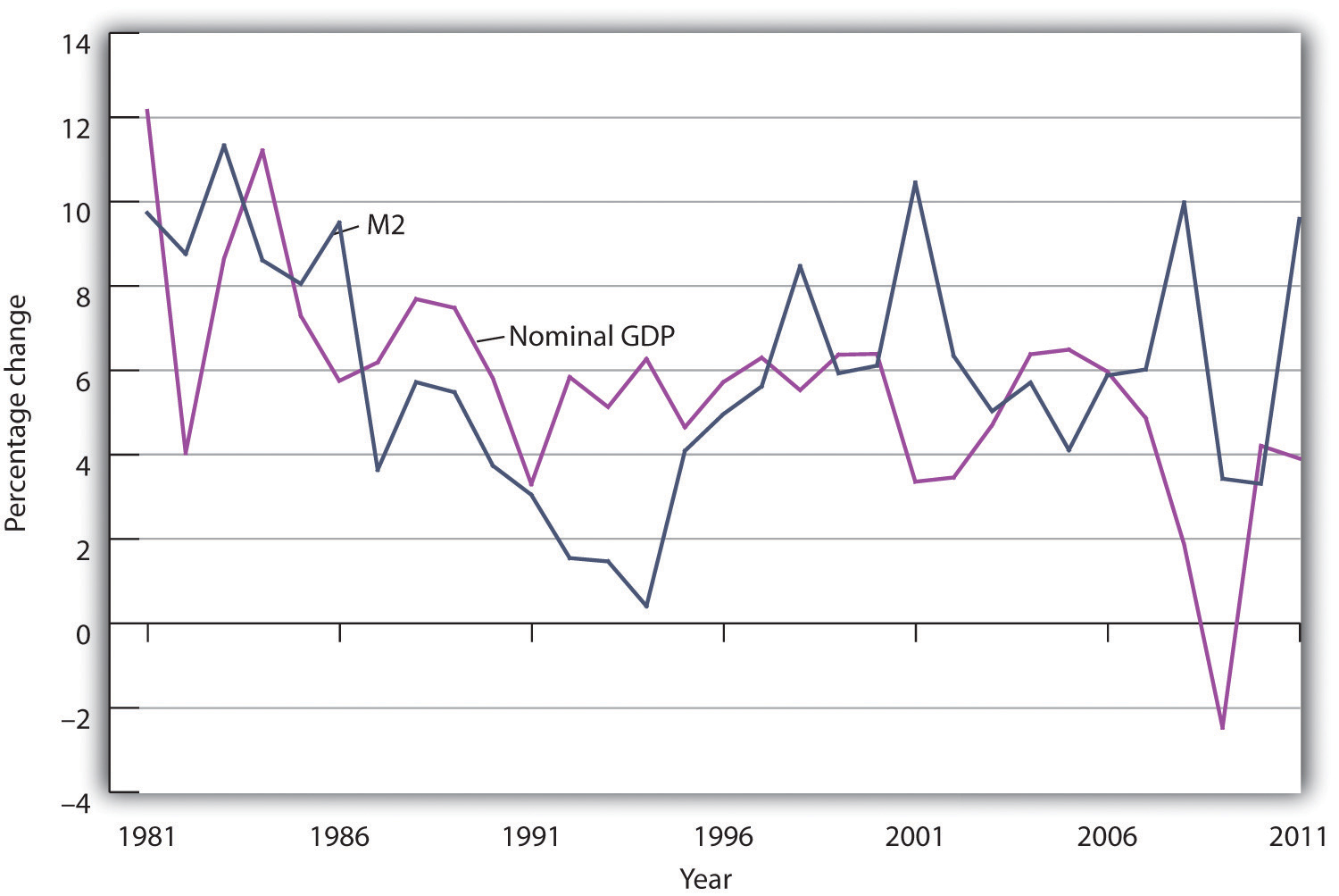 Look again at Figure 32.6 "M2 and Nominal GDP, 1960–1980". The close relationship between M2 and nominal GDP in the 1960s and 1970s helped win over many economists to the monetarist camp. Now look at Figure 32.9 "M2 and Nominal GDP, 1980–2011". It shows the same two variables, M2 and nominal GDP, from the 1980s through 2011. The tidy relationship between the two seems to have vanished. What happened?