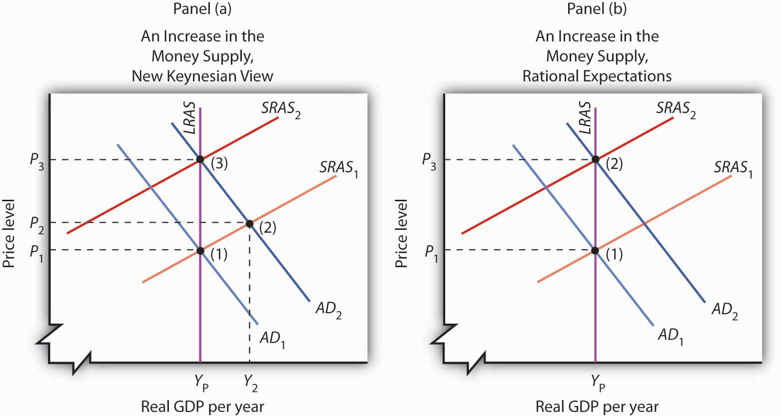 Panel (a) shows an expansionary monetary policy according to new Keynesian economics. Aggregate demand increases, with no immediate reduction in short-run aggregate supply. Real GDP rises to Y2. In the long run, nominal wages rise, reducing short-run aggregate supply and returning real GDP to potential. Panel (b) shows what happens with rational expectations. When the Fed increases the money supply, people anticipate the rise in prices. Workers and firms agree to an increase in nominal wages, so that there is a reduction in short-run aggregate supply at the same time there is an increase in aggregate demand. The result is no change in real GDP; it remains at potential. There is, however, an increase in the price level.