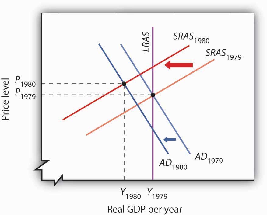 By 1979, expansionary fiscal and monetary policies had brought the economy to its potential output. Then war between Iran and Iraq caused oil prices to increase, shifting the short-run aggregate supply curve to the left. In the second half of 1979, the Fed launched an aggressive contractionary policy aimed at reducing inflation. The Fed’s action shifted the aggregate demand curve to the left. The result in 1980 was a recession with continued inflation.