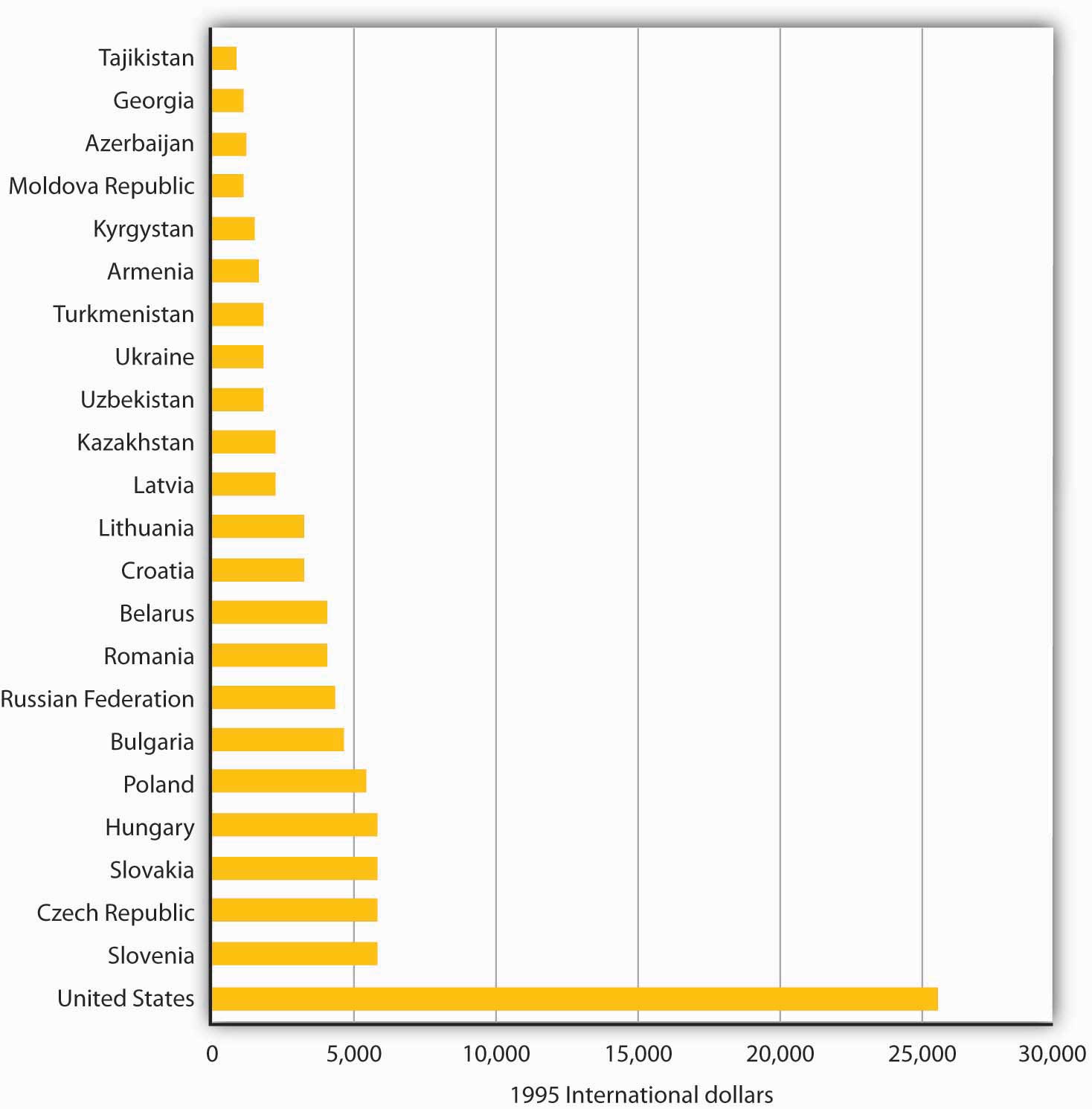 Figure 34.1 "Per Capita Output in Former Soviet Bloc States and in the United States, 1995" shows the World Bank’s estimates of per capita output, measured in dollars of 1995 purchasing power, for the republics that made up the Soviet Union, for the Warsaw Pact nations of Eastern Europe for which data are available, and for the United States in 1995. Nations that had operated within the old Soviet system had quite low levels of per capita output. Living standards were lower still, given that these nations devoted much higher shares of total output to investment and to defense than did the United States.