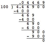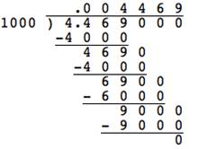 In the examples above, notice that each quotient still contains the digits 4469—but as another 0 is added to the end of each power of ten in the divisor, the decimal point moves an additional place to the left in the quotient.