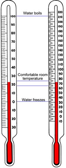By looking at the two thermometers shown, you can make some general comparisons between the scales. For example, many people tend to be comfortable in outdoor temperatures between 50°F and 80°F (or between 10°C and 25°C). If a meteorologist predicts an average temperature of 0°C (or 32°F), then it is a safe bet that you will need a winter jacket.