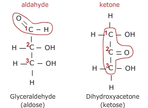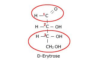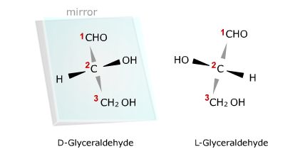 The example shown below is the three carbon carbohydrate, glyceraldehyde. This compound contains a chiral center at the middle, or second carbon, because that carbon has four different groups attached to it. The configuration of atoms in the left-hand structure causes polarized light to be rotated to the right and is therefore the D form. Its mirror image shown on the right, rotates polarized light in the opposite direction, and is therefore the L form. Note that in both compounds the H and OH groups project out of the page towards you, but in the D form the -OH group is to the right of carbon two while in the L-form it points to the left.