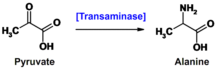 Although the metabolism of most amino acids is a complicated multi-step process, a number of amino acids enter the main oxidative pathways by a single transaminase reaction. In the transaminase reaction a ketone group is replaced by an amino group. For example, the amino acid alanine is converted to pyruvate by the following transaminase reaction: