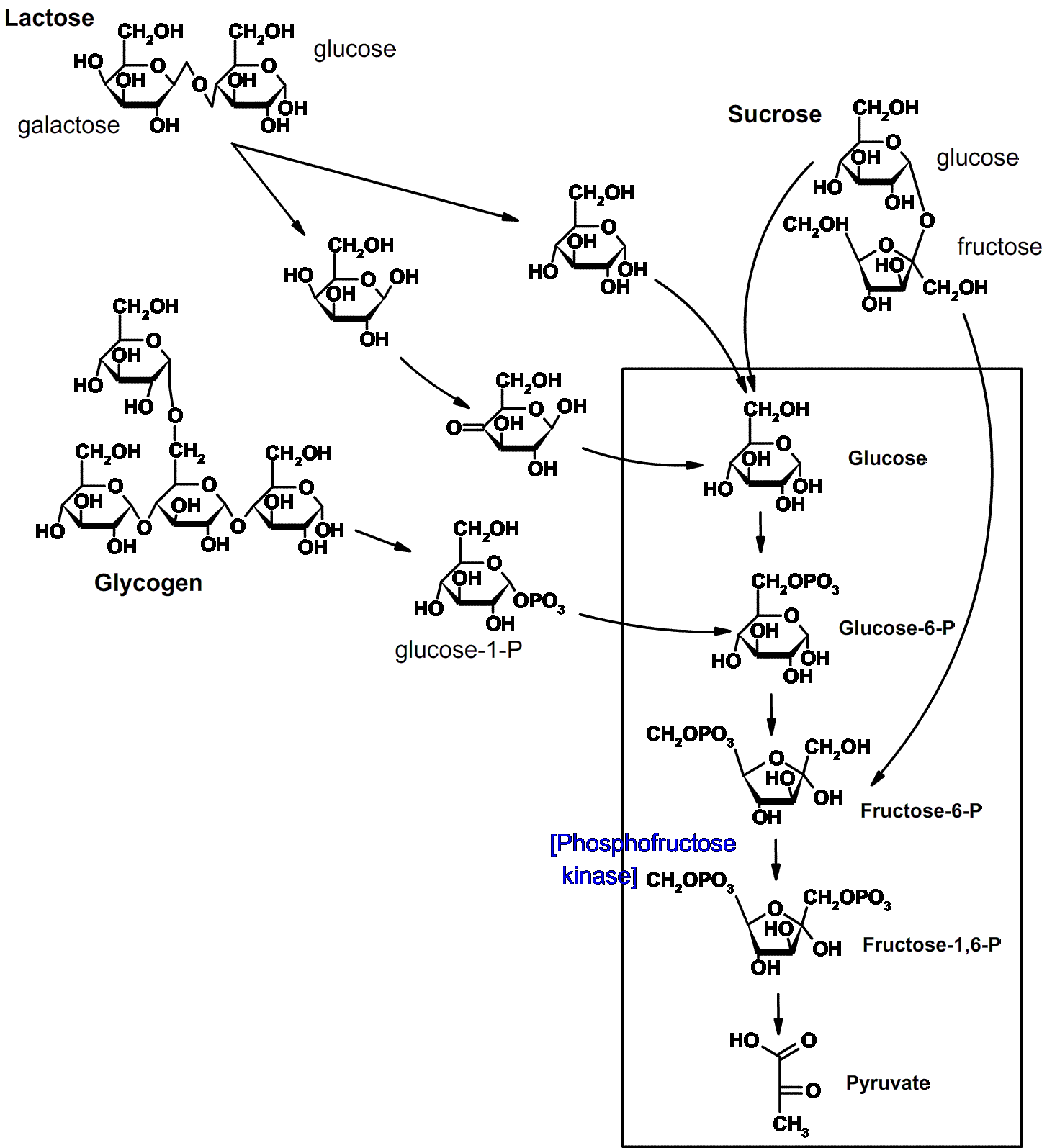 Complex carbohydrates are converted to monosaccharides and enter glycolysis at a number of different points. Most monosaccharides enter glycolysis above the step catalyzed by phosophofructose kinase (PFK). Consequently, the degradation of practically all sugars is controlled by this key regulatory enzyme.