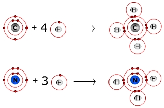 We saw with water that the orientation of atoms around the oxygen was tetrahydral with the angle between the two hydrogen atoms close what would be expected for a tetrahydral shape. Both carbon and nitrogen also form tetrahydral shapes. In the case of methane the four hydrogen atoms are at the corners of a tetrahydron. In ammonia, the three attached hydrogens form the base of a tetrahydron. In the ammonium ion, the addition of a fourth hydrogen, to form NH4+, places the fourth hydrogen at the last unoccupied corner of the tetrahydron.