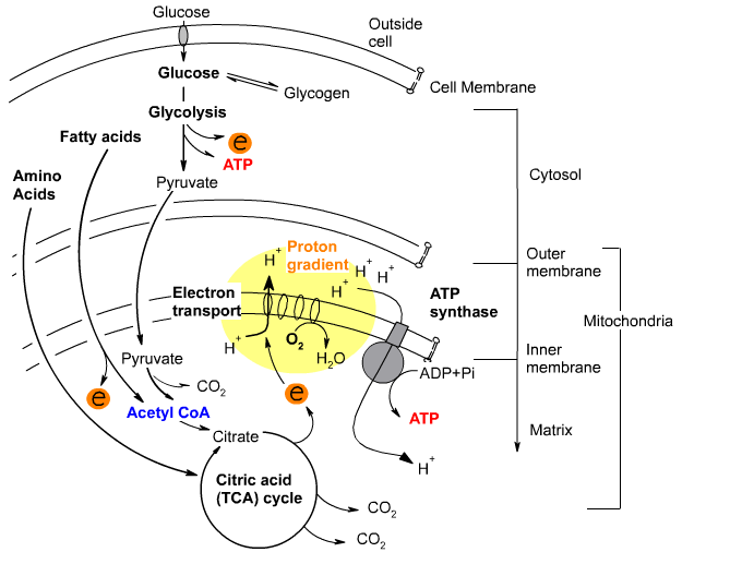 | Metabolism Overview The four key pathways, glycolysis, the TCA cycle, electron transport, and ATP synthesis are outlined in yellow. Glucose that is brought into the cell via the glucose transporter can suffer two fates, oxidation or storage as glycogen. Oxidation occurs in glycolysis and the TCA cycle, releasing the carbon atoms in glucose as CO2. Note that oxygen is not used until the end of the electron transport chain. High energy electrons, symbolized as orange balls are carried on organic electron carriers to the electron transport chain. As these electrons move through the four complexes, protons are pumped from the mitochondrial matrix across the inner mitochondrial membrane. As these protons flow back through the membrane via ATP synthase, ATP is generated. Refer to page. |