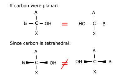 An important aspect of carbon bonding is the fact that carbon can covalently bond to four groups and that the bonding geometry of the carbon atom is tetrahedral. Therefore, if the four groups attached to the carbon are different, then two unique arrangements of the groups around the carbon atom are possible and this carbon is said to be an asymmetric center or a chiral center. The two arrangements of groups about the carbon are mirror images of each other and these two structures are referred to as enantiomers. It is impossible to superimpose these two mirror images, consequently they are distinct molecules.