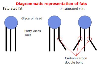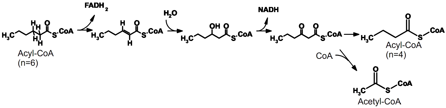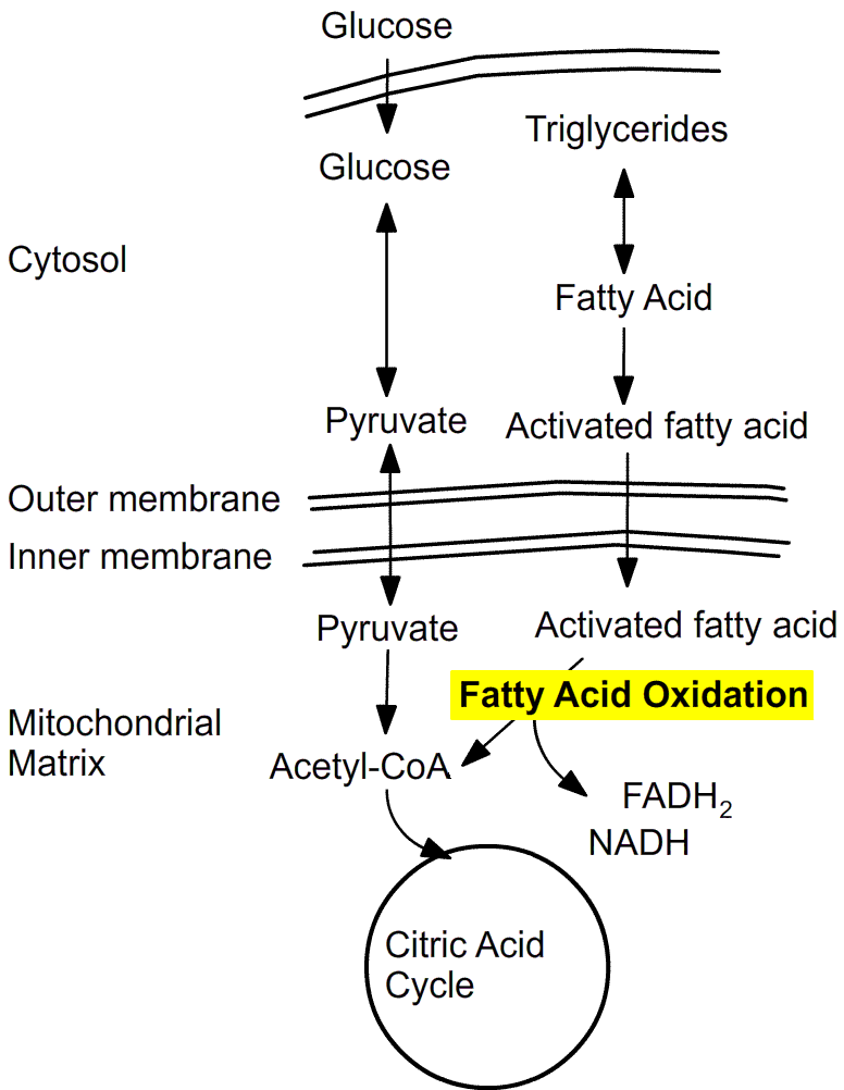 Fats are stored in cells as triglycerides, the condensation product of three fatty acids with the three carbon polyalcohol glycerol. Hormonal stimulation by glucagon or epinephrine activates lipases which release the fatty acids from the glycerol. The fatty acids are activated for oxidation in the cytosol by the addition of an coenzyme A group to the carboxylic acid, forming acyl-CoA. After activation, the activated fatty acid is transported to the mitochondria where it is subject to a pathway called beta-oxidation. This process releases acetyl-CoA molecules from the fatty acid, generating NADH and FADH2. The acetyl-CoA enters the TCA cycle for further oxidation.