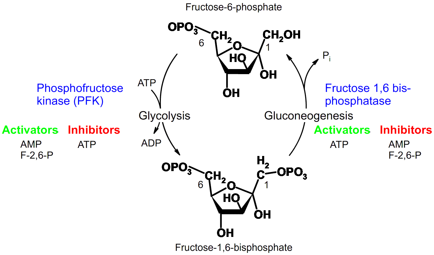 Regulation of PFK in glycolysis and fructose 1,6 phosphatase in