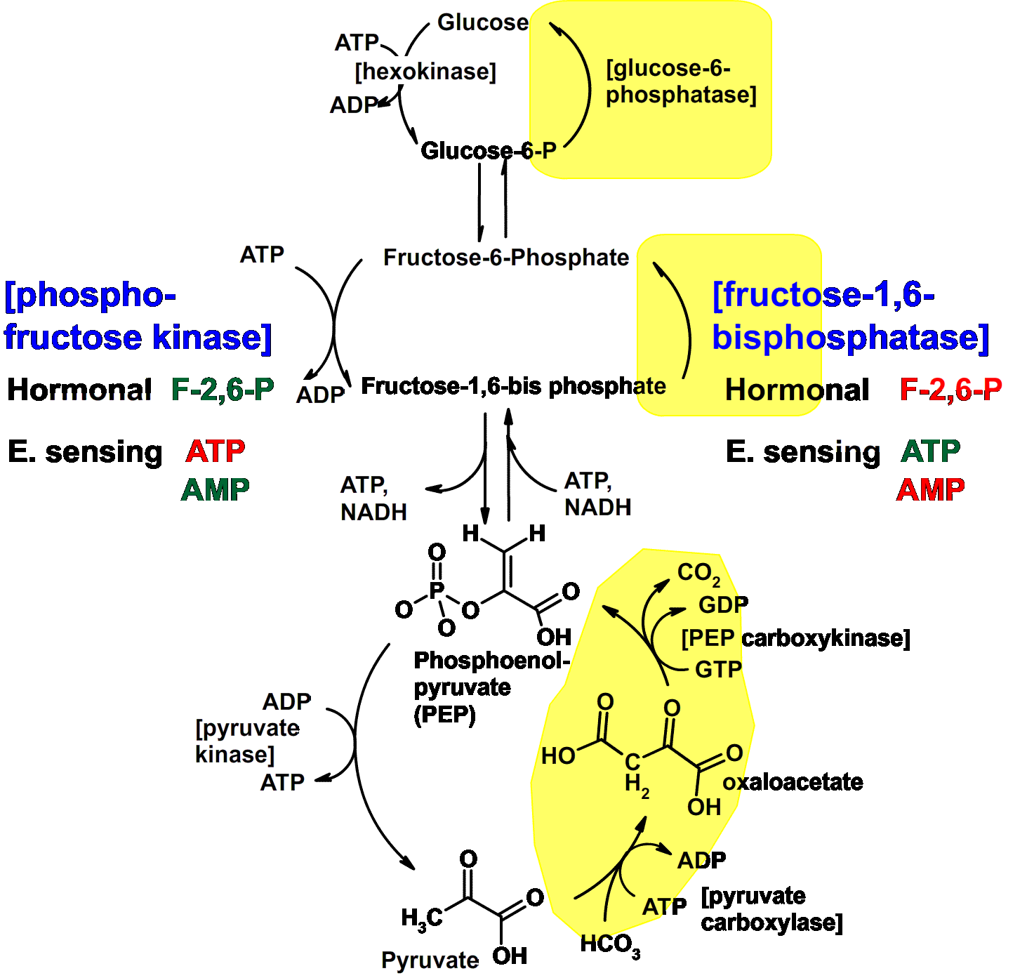Note that these two enzymes are regulated in a coordinated manner such that only one pathway, glycolysis or gluconeogenesis, is turned on at one time.