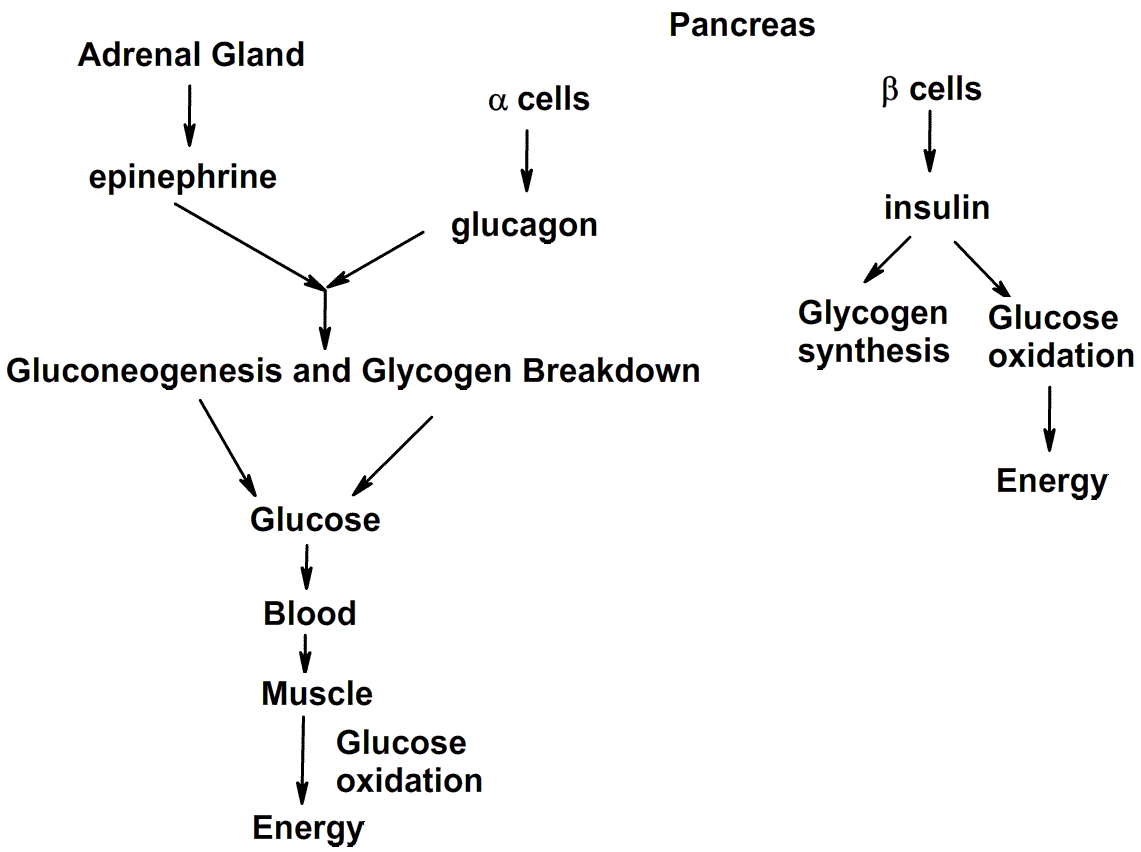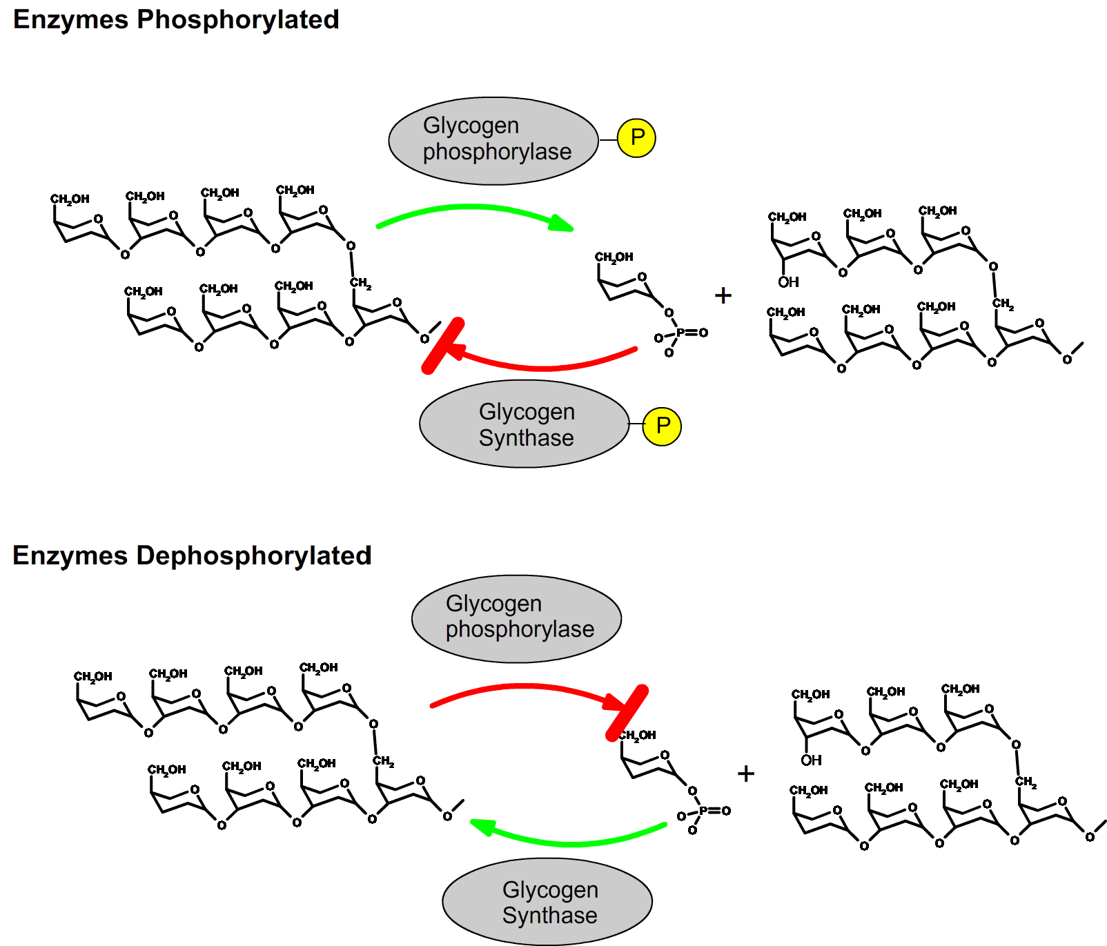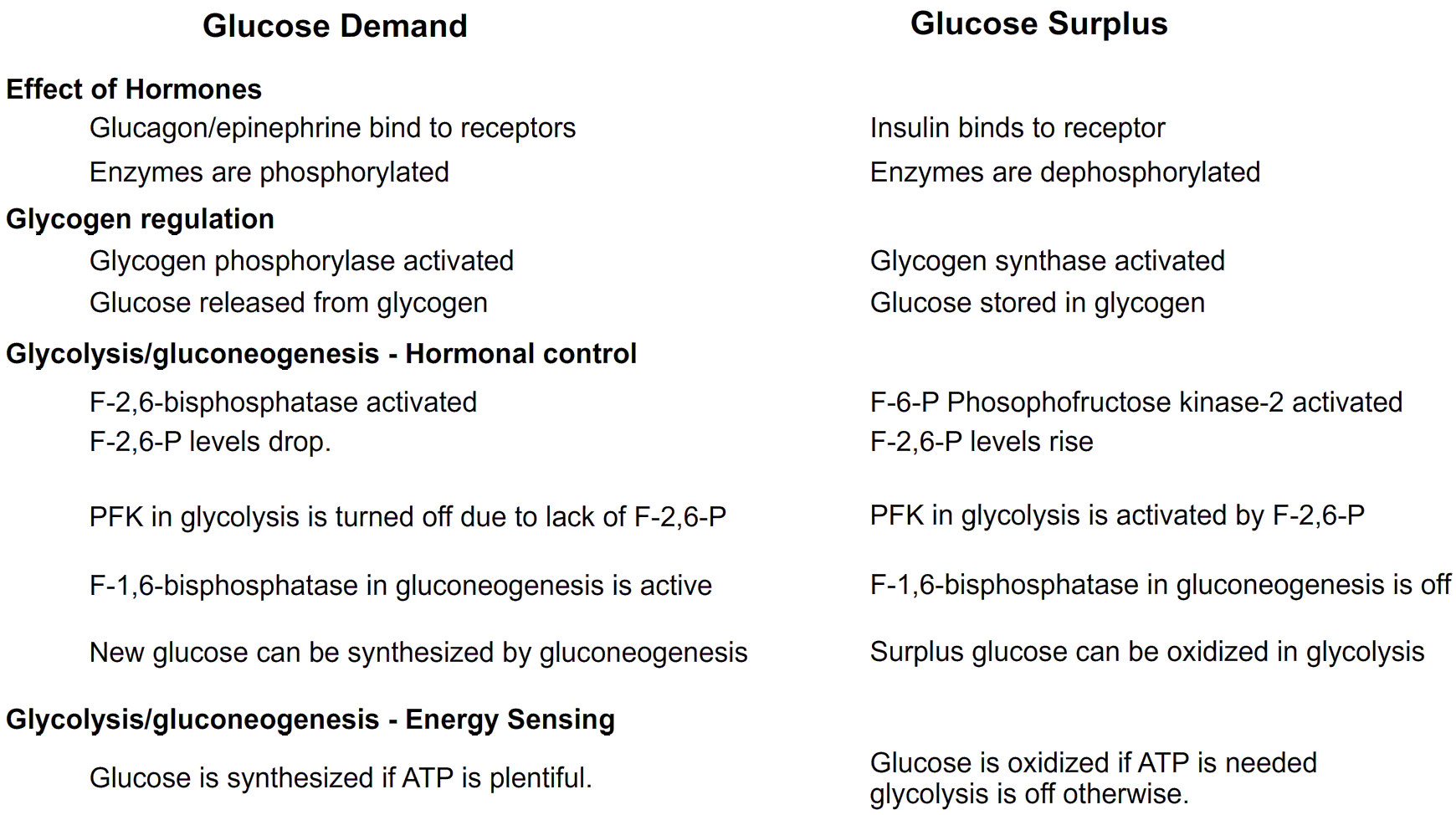 The coordinated regulation of glycolysis and gluconeogenesis dovetails perfectly with the direct hormonal control of glycogen metabolism to insure the liver cell responds appropriately to hormonal signals, i.e. the production and release of glucose when glucagon or epinephrine are present, or the storage and, if required, the oxidation of glucose when insulin is present.