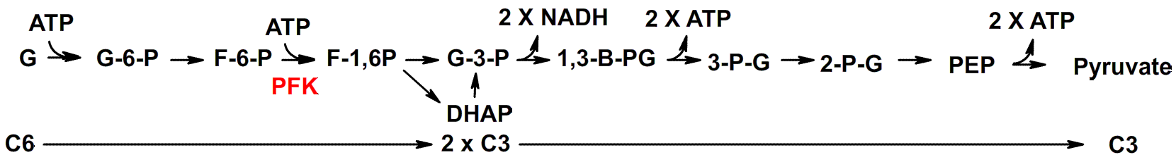 glycolysis. The enzymes whose names are colored red, phosphofructose kinase (PFK) and