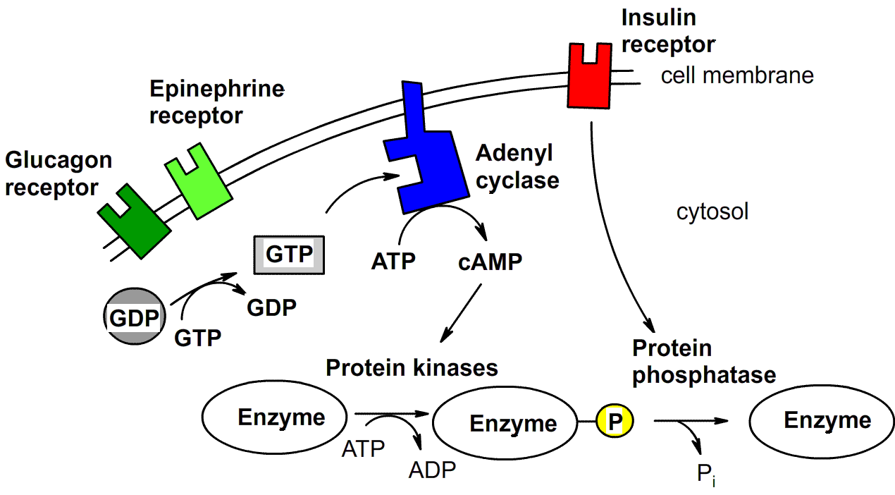 Glucagon and epinephrine cause phosphorylation of enzymes. The enzyme